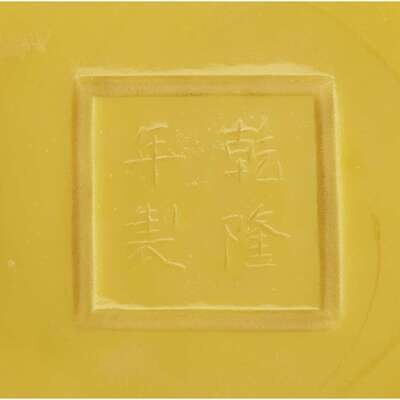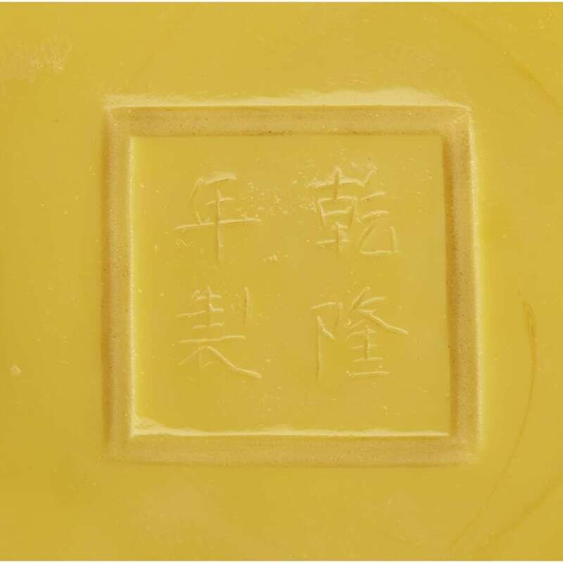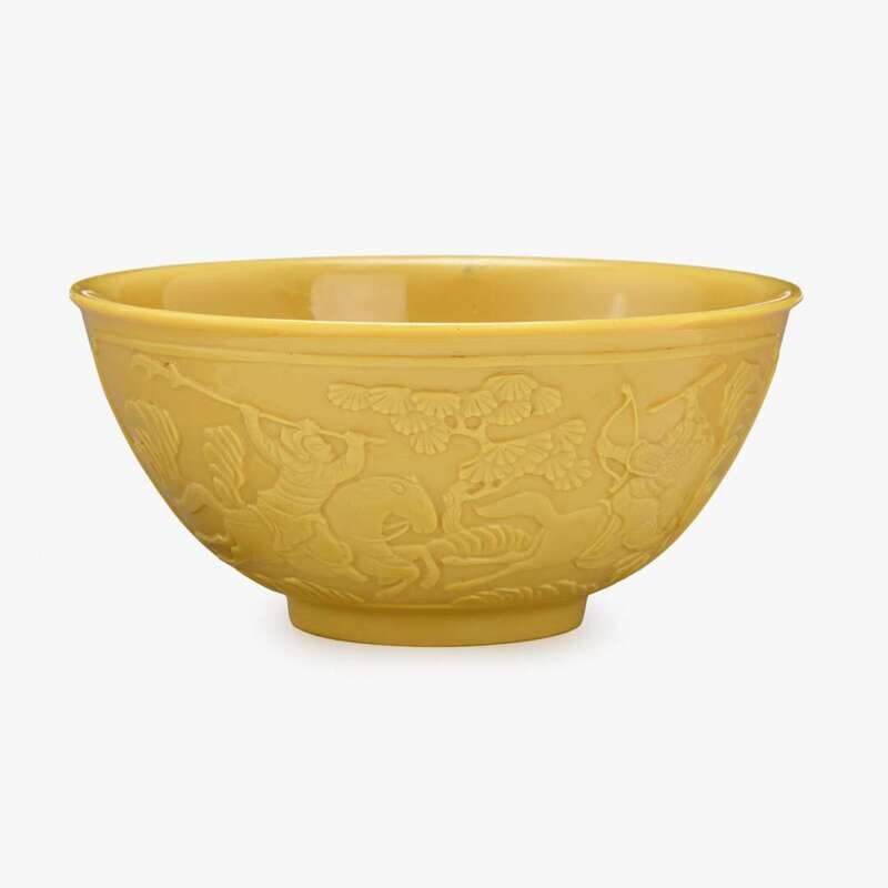 A Chinese yellow glass bowl, carved with warrior figures qianlong four-character wheel-cut mark within a square and of the period