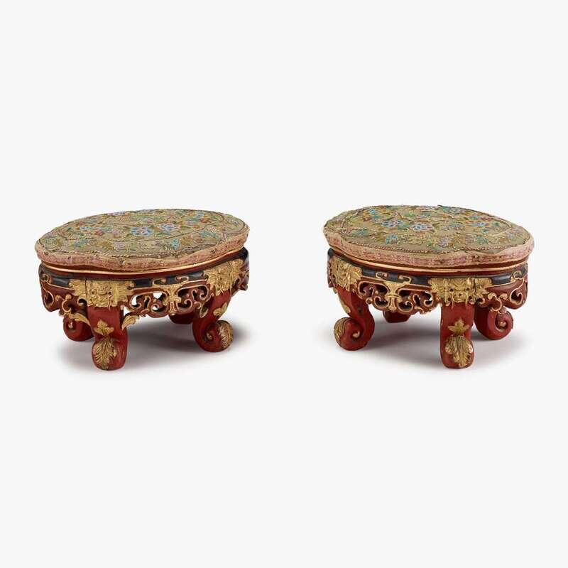 A pair of Chinese gilt and lacquer painted wedding stools with beaded coverings, Bangku Kaki Kahwain 19th century
