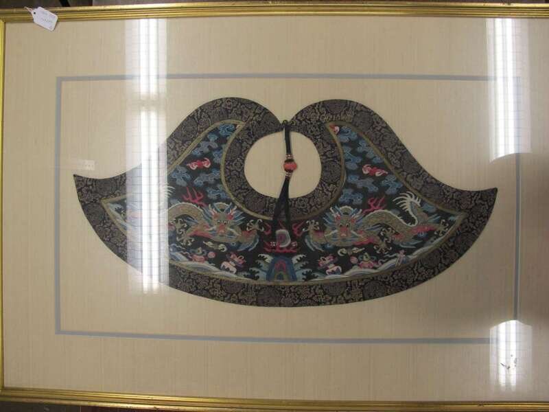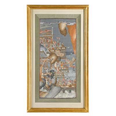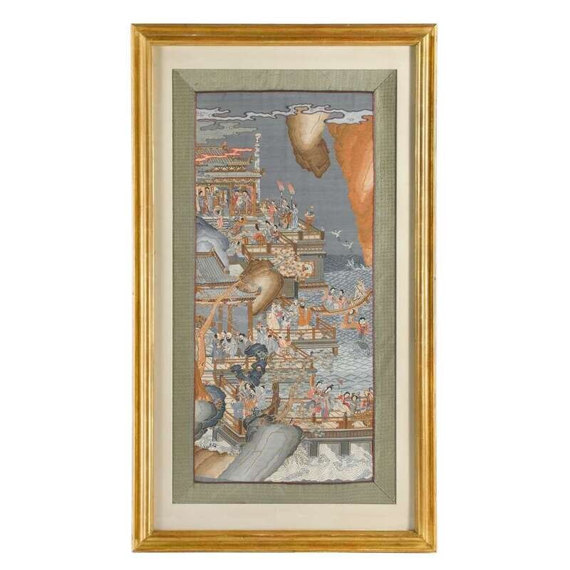 A large Chinese silk kesi panel, depicting an assemblage of immortals converging at a seaside palace (2) 19th century