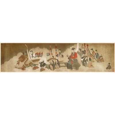 Mounted handscroll, ink and color on silk, three seals to painting. Sight H: 10 3/4 in., 27.3 cm; W: 42 3/4 in., 108.6 cm