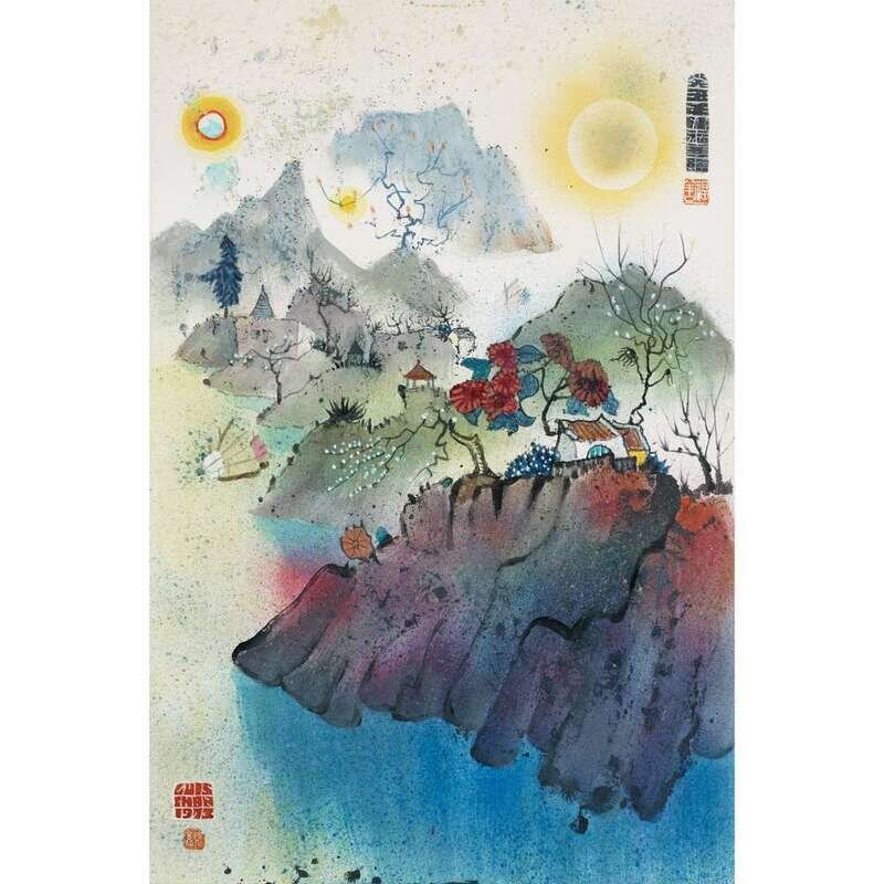 LUIS CHAN (CHEN FUSHAN, 1905-1995) DATED 1973 LAKESIDE SCENE UNDER THE SUN AND THE MOON