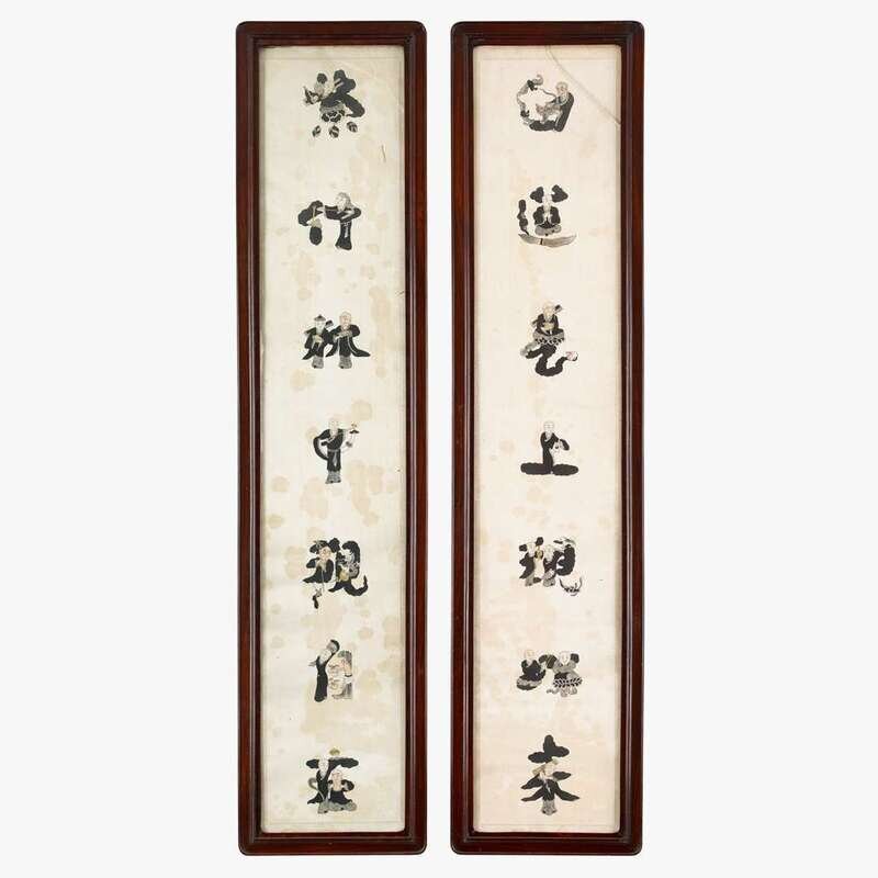CHINESE SCHOOL LATE QING DYNASTY BUDDHIST COUPLET IN COMICAL FIGURAL SCRIPT