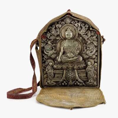 A large Tibetan 'Gau' mixed-metal travel shrine with woven cloth case 19th century
