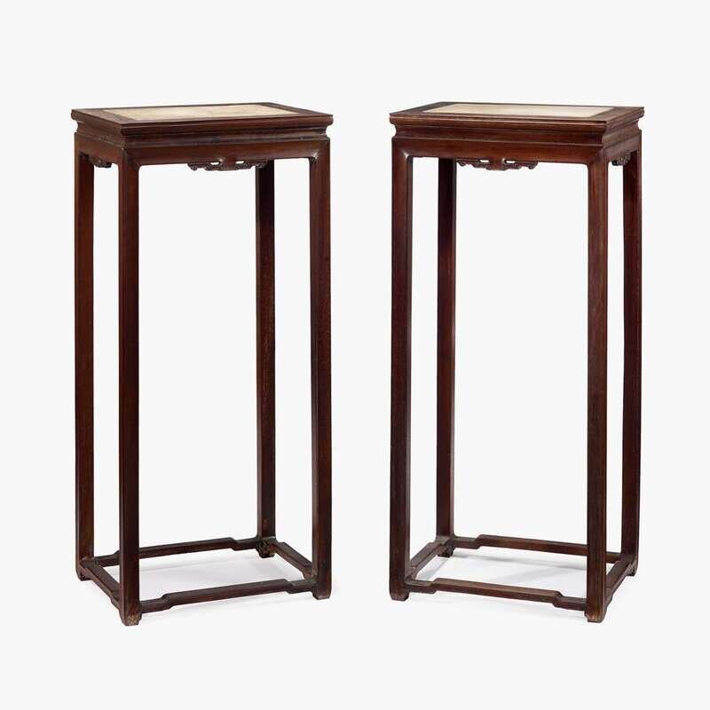 A pair of tall Chinese white marble-inset hardwood stands 19th/20th century