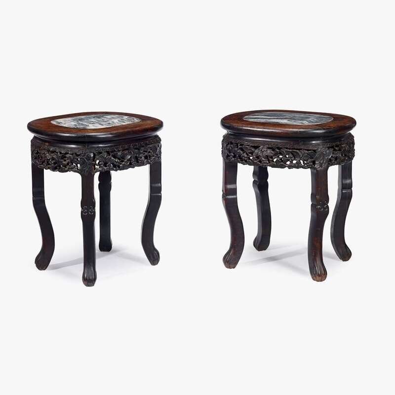 A pair of Chinese dreamstone-inset hardwood stools 19th century