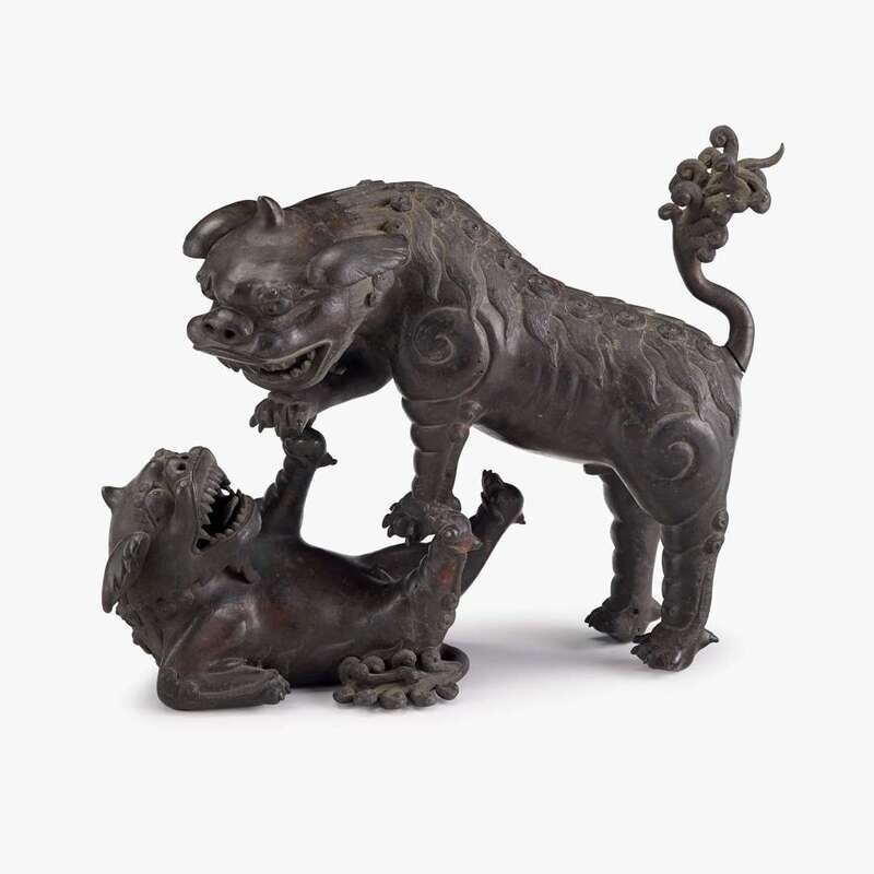 Two Chinese cast bronze acrobatic Xiezhi early qing dynasty