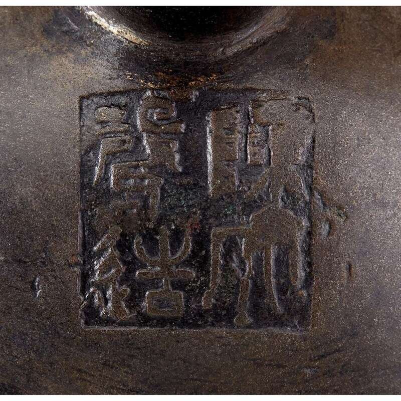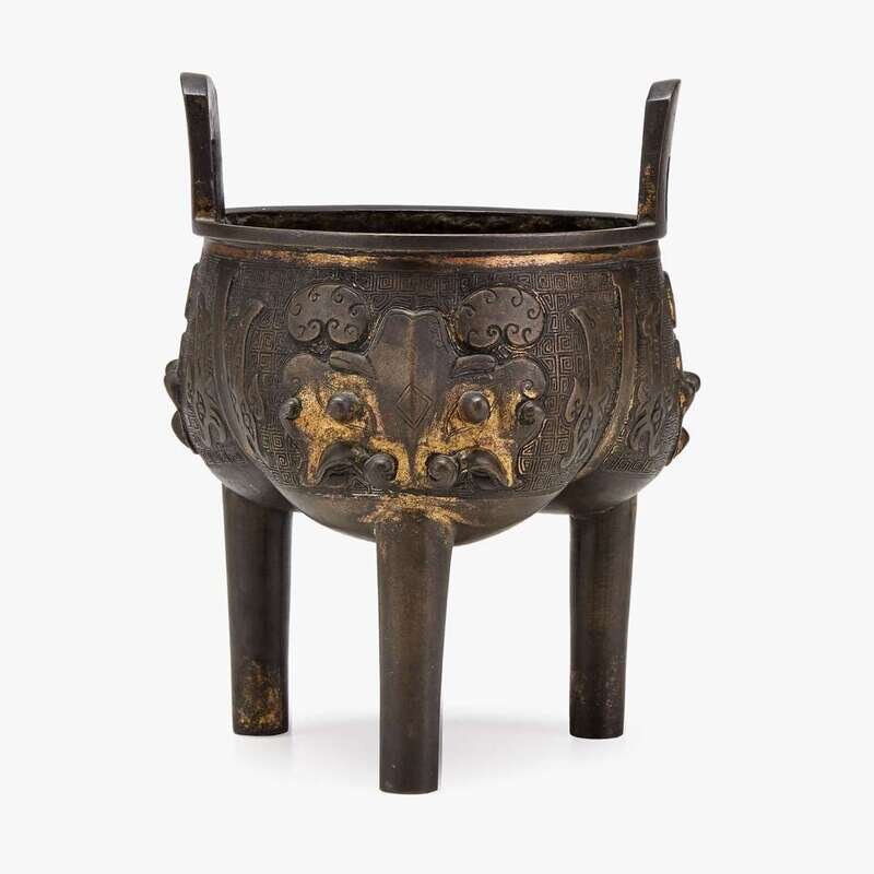 A Chinese archaistic gilt-bronze tripod censer with taotie mask decorations to body chen da sheng zao mark to base, qing dynasty