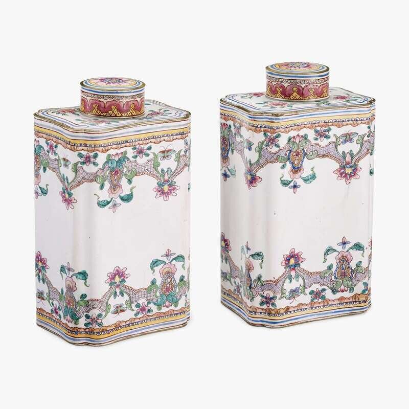 A pair of Chinese canton enamel curved rectangular tea caddies 18th century