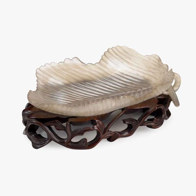 A Chinese agate leaf-form brush washer with ring handle 18th century