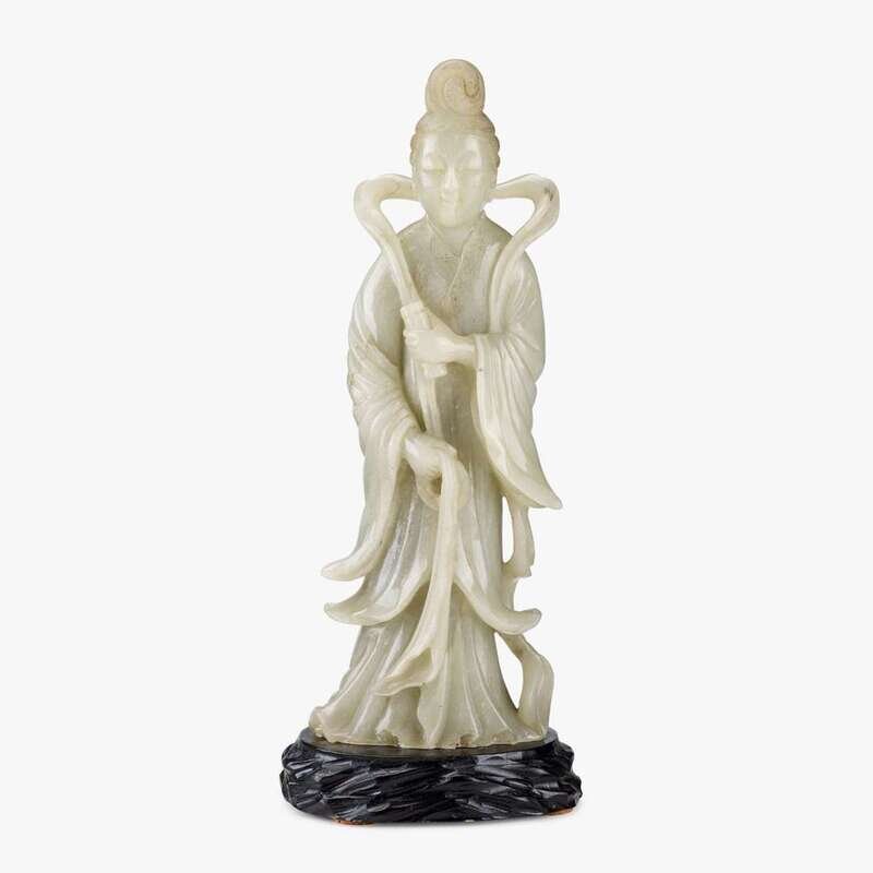 A Chinese carved celadon jade meiren with flowing scarf and scroll 19th century