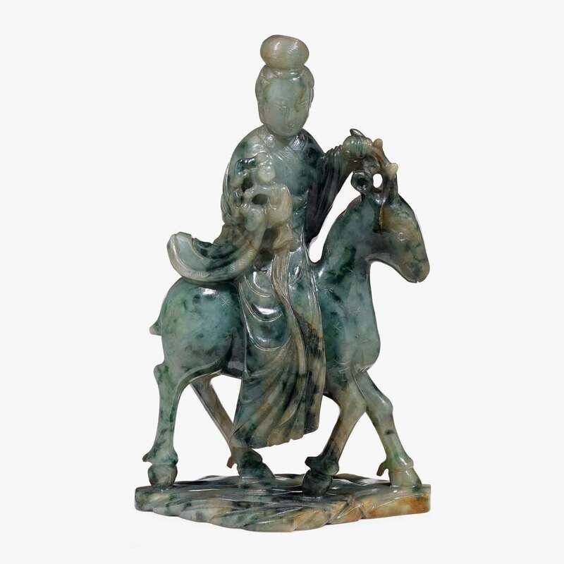 A Chinese mottled green jade figure of Guanyin on a deer holding a lingzhi 19th century
