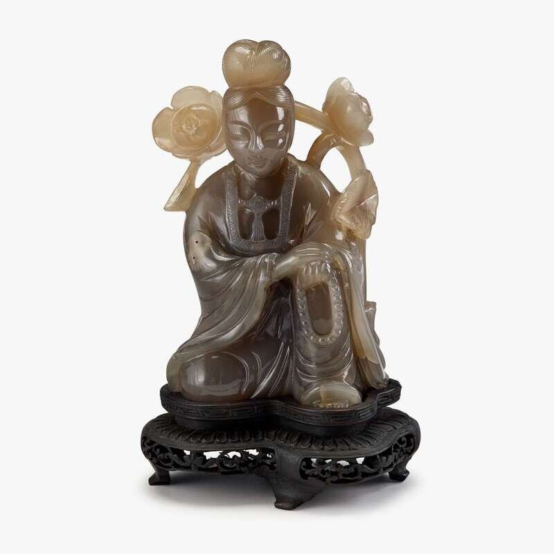 A Chinese agate carving of Guanyin on bended knee with flowering branch late qing dynasty