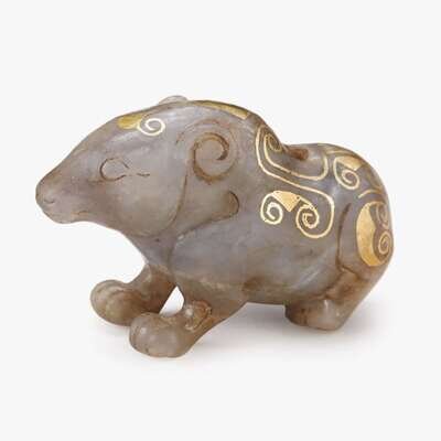A Chinese gray jade and gilt-decorated toggle of a mythical creature qing dynasty or earlier