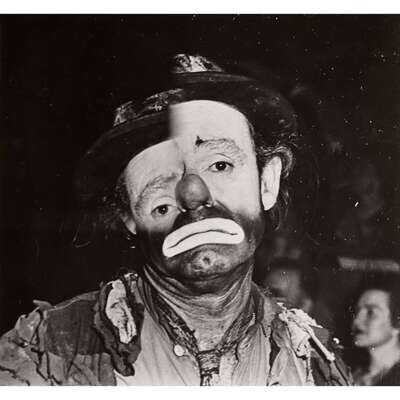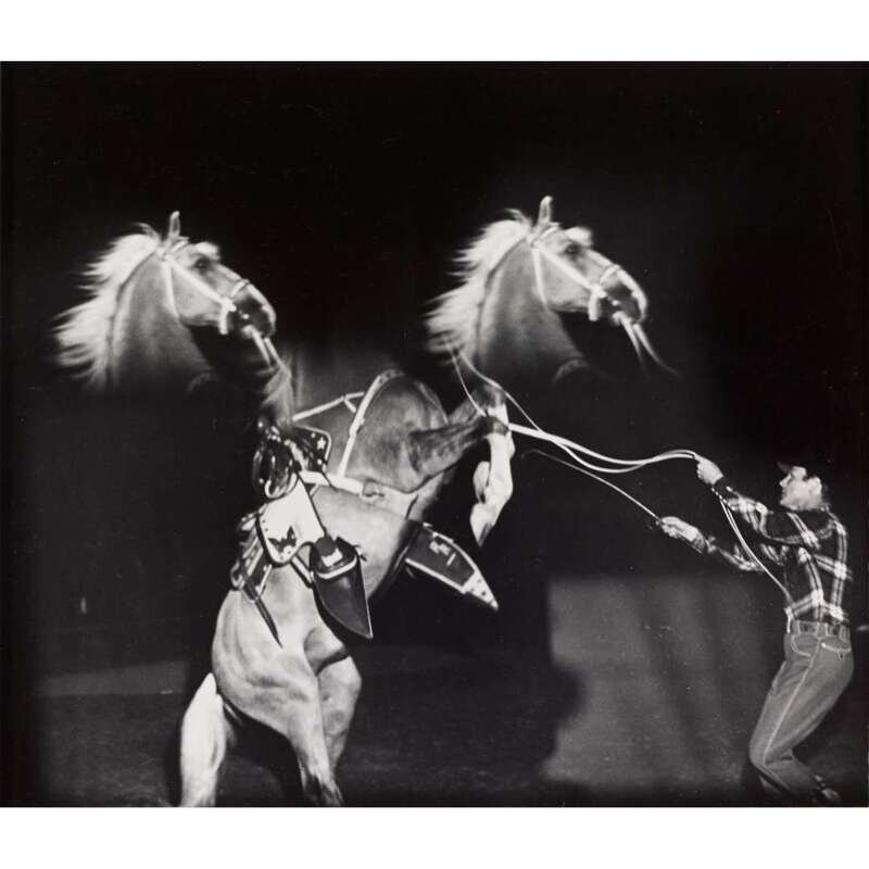 Emmet Kelly, rearing horse and handler, sequinned performer balancing atop another performer