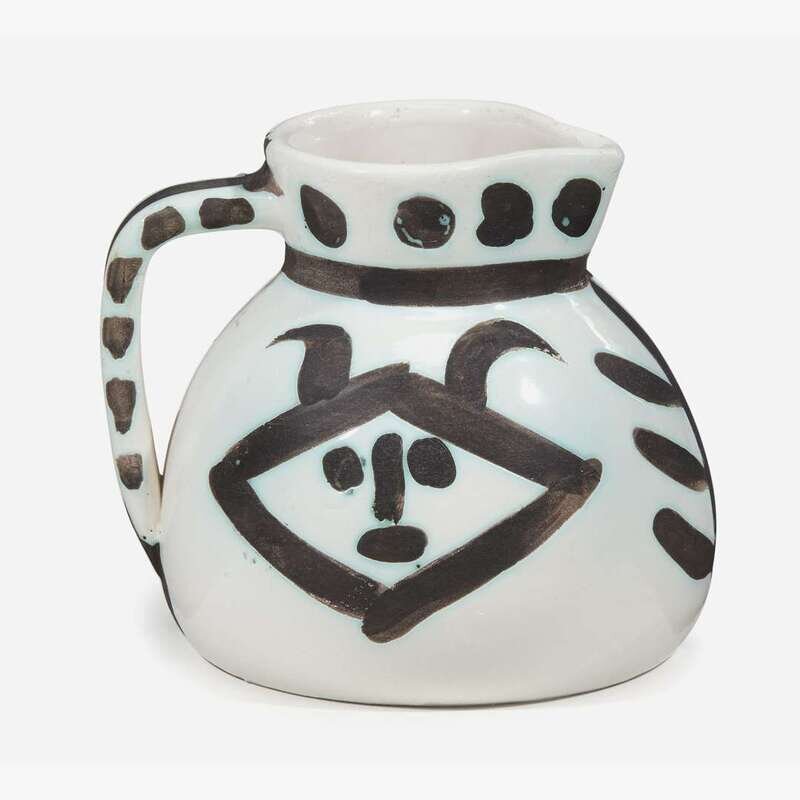1956, from the edition of 500, inscribed 'EDITION PICASSO' and with the 'EDITION PICASSO' and the 'MADOURA PLEIN FEU' stamps on the underside, white earthenware clay pitcher, with oxidized paraffin decoration and white enamel.