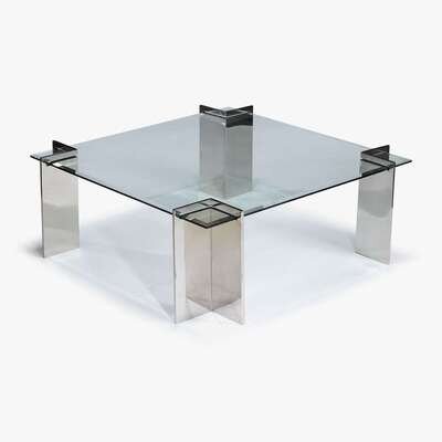LEON ROSEN CHROMED STEEL AND GLASS COFFEE TABLE, PACE, 1970s