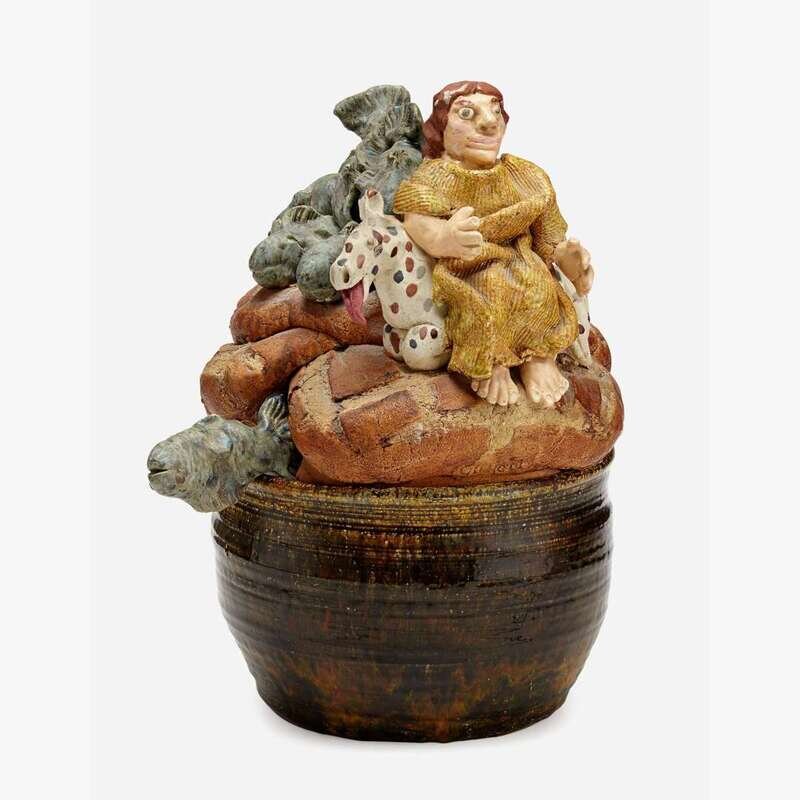 DAVID GILHOOLY (1943-2013) FIGURAL CERAMIC TUREEN AND LADLE, 1976