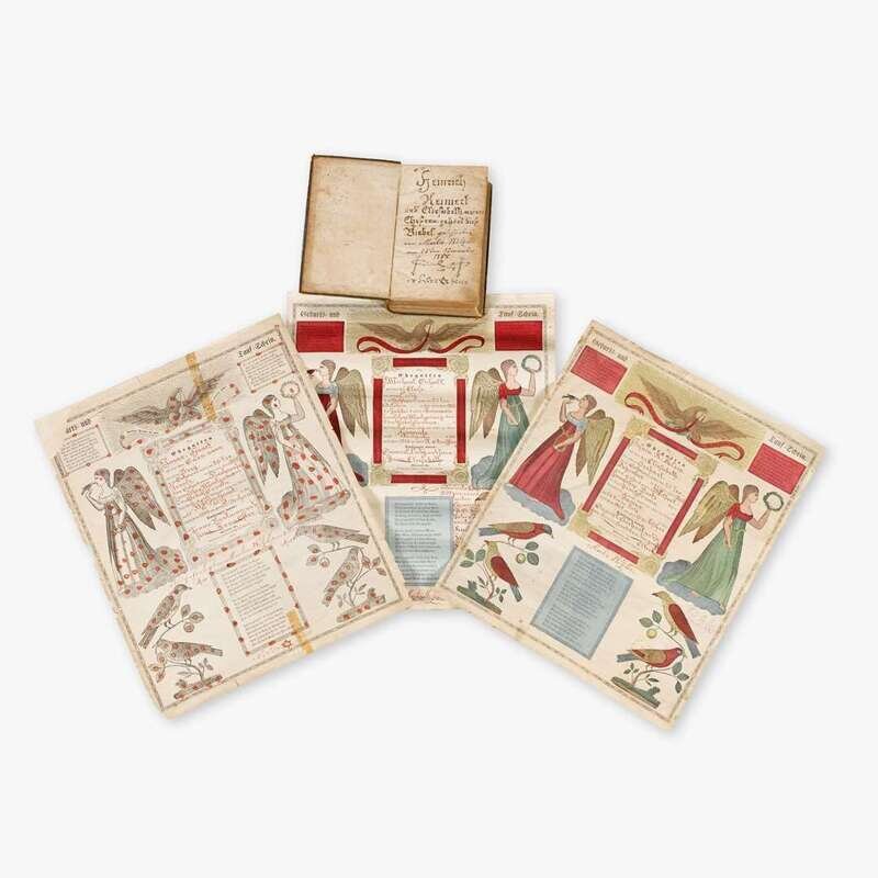 859," and "1863" The printed Allentown Taufschien forms filled in by Wetzler, two with additional Hebrew inscriptions and Star of David; the bible bookplate for Heinrich Keinert and his wife Elizabeth, dated, "November 25, 1857," also with additional Hebrew inscription and Star of David.