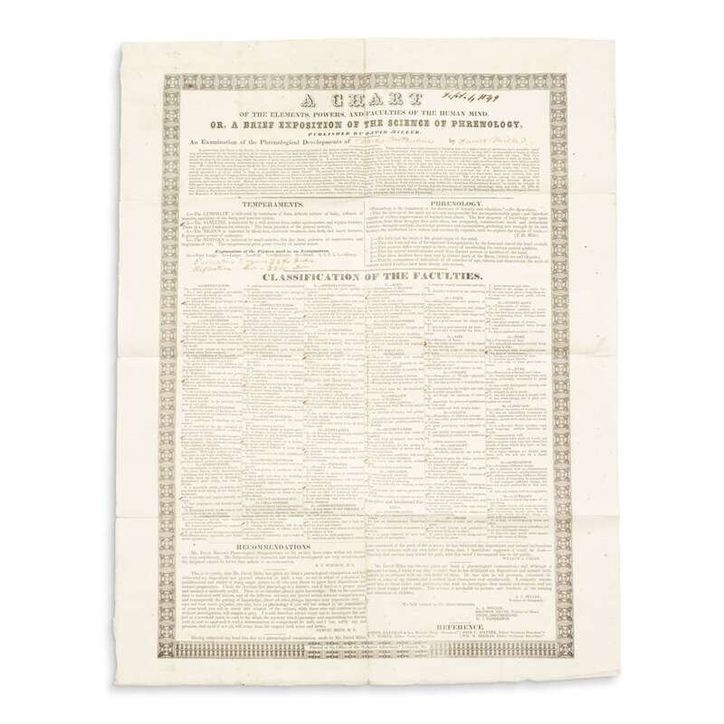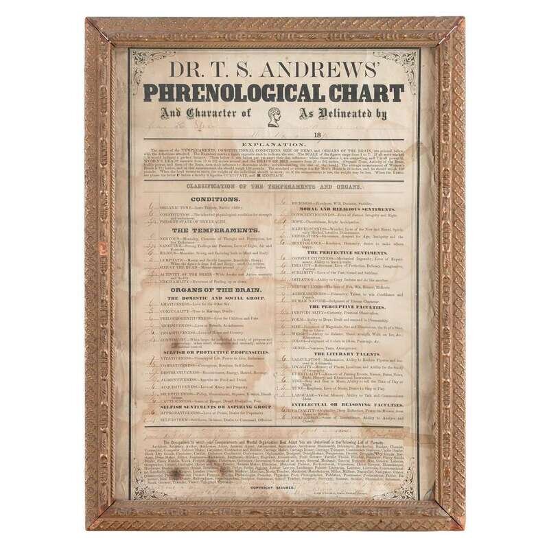 Including a framed chart by Dr. T.S. Andrews, dated, "May 14, 1870," and assorted charts by Madame Adolph, Prof. Albert Bausch, D.C. Campbell, H.E. Corman, E.W. Eagar, W. Felch, Frank Wm. Hawkins, James Howarth, J.B. Keswick, E. Koyl, J. Melrose, David Miller, A. O'Leary, Charles Pinkham, Thomas Pons, Prof. N.N. Riddell, Wm. Seymour, Thomas Sim, Jr., Thomas Chittenden Taplin, J. Palmer Webster, U.S. Weirick, Marcia Greene Wellington, Samuel Wells, Prof. Wm. Windsor, A.J. Wright and others.