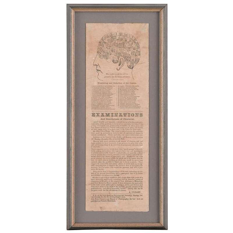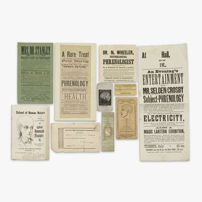 Consisting of broadsides, including one by A.O'Leary, framed; handbills; a receipt for admission to the Boston Phrenological Society; and other assorted advertising material, as well as printed transcripts for lectures directly or indirectly related to phrenology, including Combe, George. An Address Delivered at the Anniversary Celebration of the Birth of Spurzheim, and the Organization of the Boston Phrenological Society December 31, 1839 (Boston: Marsh, Capen, Lyon & Webb, 1840); and Follen, Charles. Funeral Oration: Delivered Before the Citizens of Boston Assembled at the Old South Church Nov. XVII at the Burial of Gaspar Spurzheim, M.D... (Boston: Marsh, Capen & Lyon, 1832).