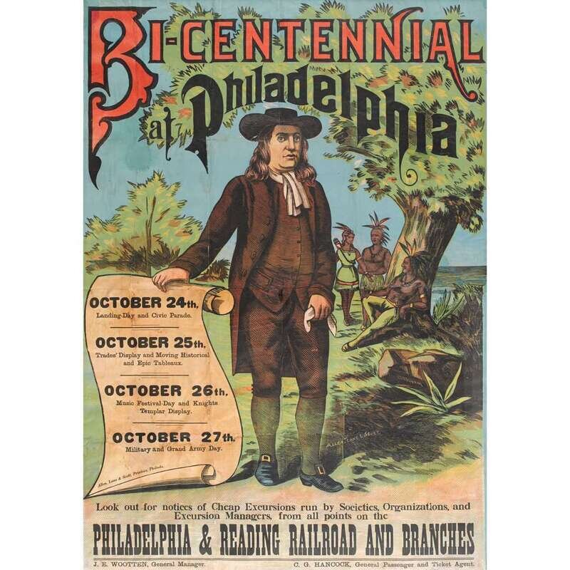 1882 Bi-Centennial of Philadelphia colored woodblock railroad tour poster publisher: philadelphia & reading railroad, printer: allen, lane & sco
