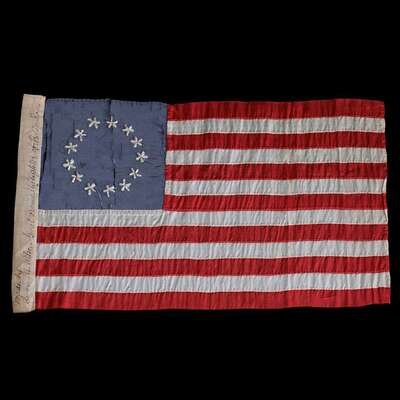 Hoist with hand-written ink inscription, "Made by Sarah M. Wilson, great grand-daughter of Betsey Ross, East Wing of Independence Hall, Philadelphia, November 22, 1909," hand-sewn and embroidered canton, framed.