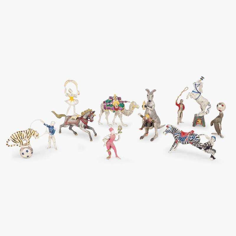 Group of sterling silver and enamel circus figures: animals and their trainers gene moore (1910-1998) for tiffany and co., new york, ny, circa 1990