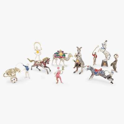 Comprising a snake charmer; a kangaroo holding a baby bottle with a performer in its pouch; a seal balancing a ball on its nose; two horses: one rampant on decorated stand, the other galloping with ballerina standing on its backside; a tiger balancing on a ball with trainer, a lion tamer, a rearing zebra with clown; and an acrobat arched over the backside of a camel, each marked "Tiffany & Co." and "Sterling 925," some further marked, "Made in Italy."