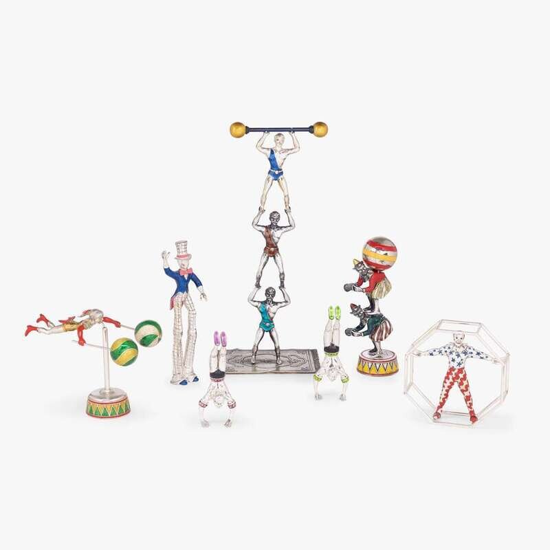 Comprising a stilt walker; a tower of three stacked strong men standing atop a rug, the topmost holding a dumb bell; an acrobat in an octagonal wheel; two men performing handstands; a female acrobat balancing on her chin; and two stacked accordion players, the topmost balancing a ball on its back, each marked "Tiffany & Co." and "Sterling 925," one further marked, "Made in Italy."