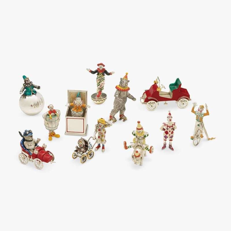 Comprising a clown riding a pig; a bear on roller skates; a clown riding a unicycle; a clown pushing a baby carriage; a jack-in-the-box; a bear driving a red car; a standing harlequin clown; a clown in a barrel; two clowns on balls; and a clown car, all marked "Tiffany & Co." and "Sterling 925," some further marked, "Made in Italy."