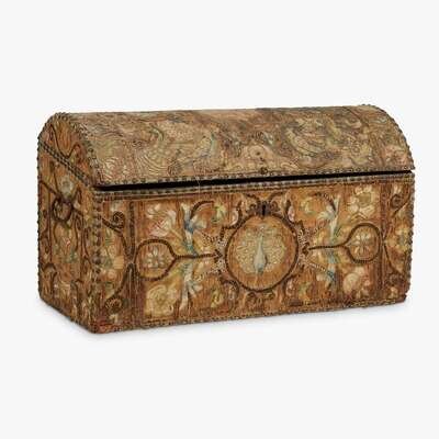 With front and domed lid covered in finely worked polychrome silk embroidered panels centered by peacocks encased in roundels issuing a symmetrical pattern of semi-naturalistic flowers, leaves, and scrolls; the sides similarly decorated; the lid opening to an interior lined in vivid green silk.