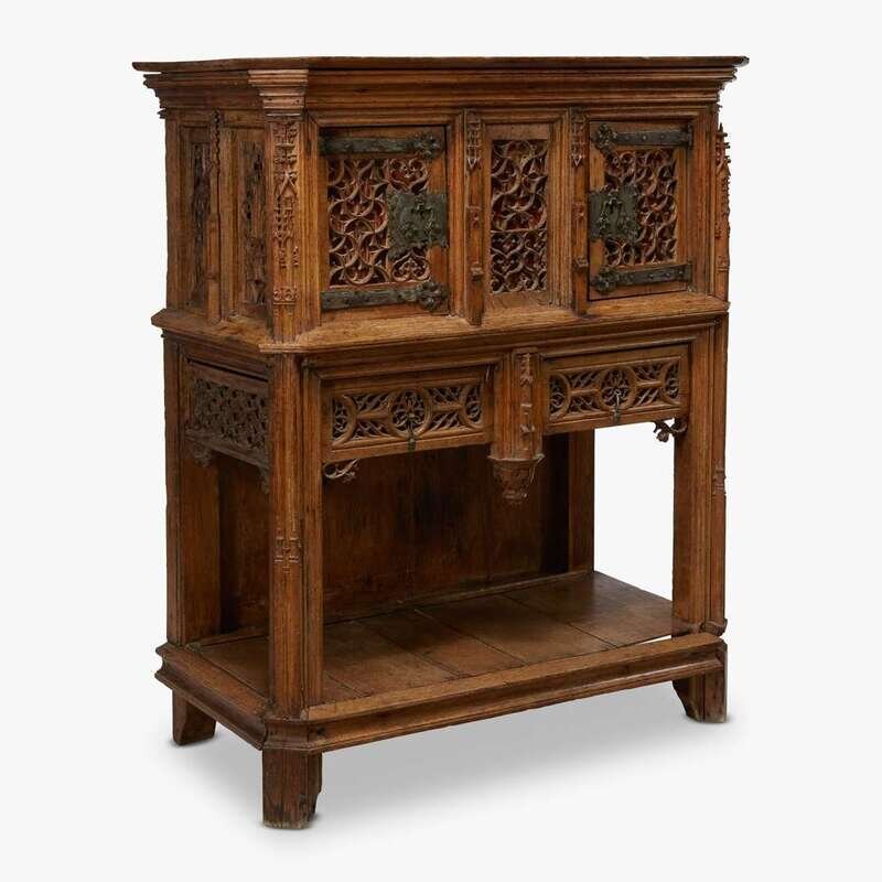 Flemish Gothic style oak cabinet on stand 19th century, with earlier elements