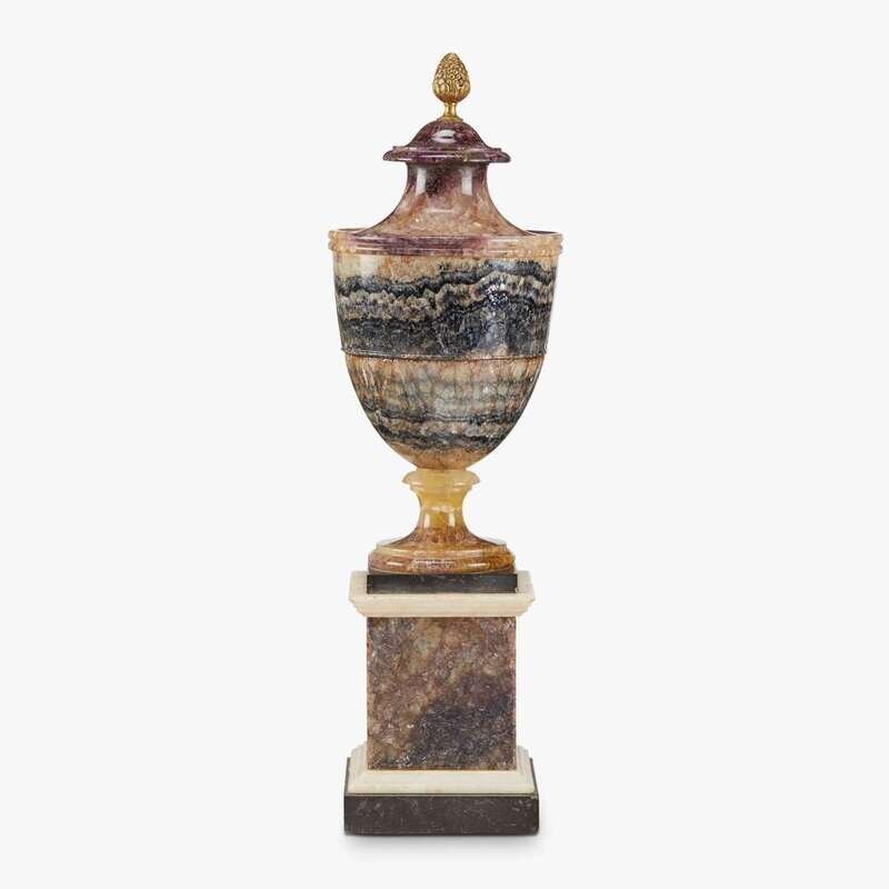 Surmounted by an integral cover terminating in gilt bronze pinecone finial, raised on Ashford and white marble base.