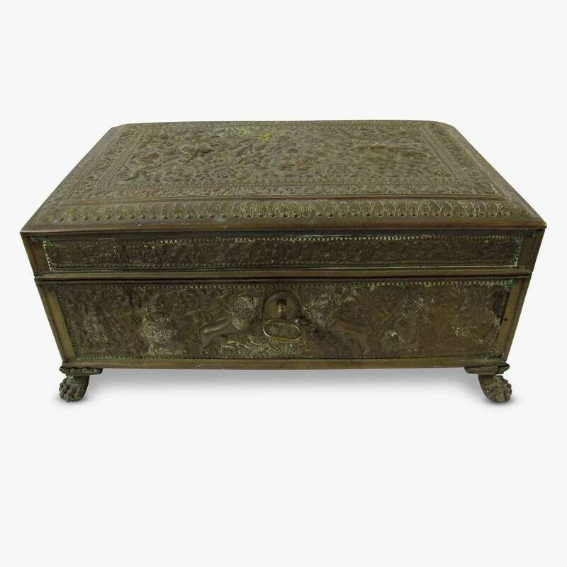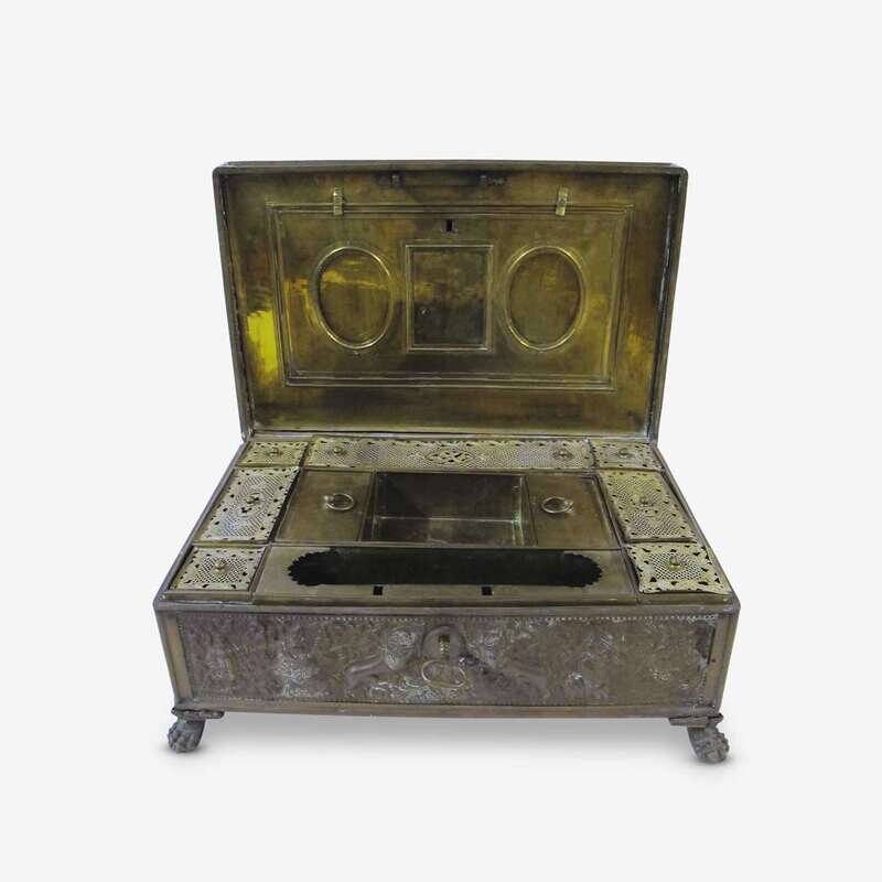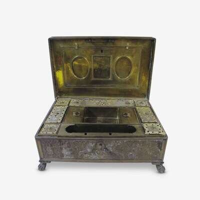 The bronze chest cast with figural and scrolling foliate motifs, the lid opening to reveal a brass interior with two locked compartments and fittings for various vanity and personal effects; mounted to sides with handles and raised on four paw feet.