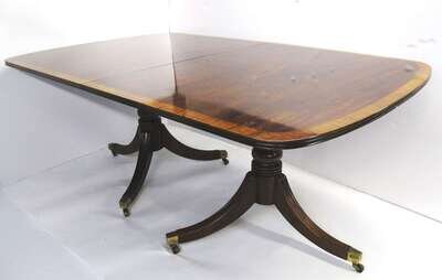 With banded edge, having four leaves above two turned pedestals, each with three fluted outswept legs raised on casters.
