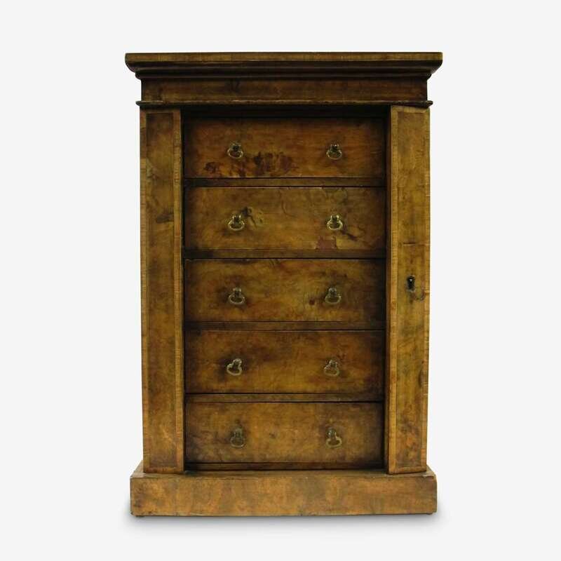 Victorian feather-banded burl walnut and mahogany five-drawer Wellington chest mid 19th century