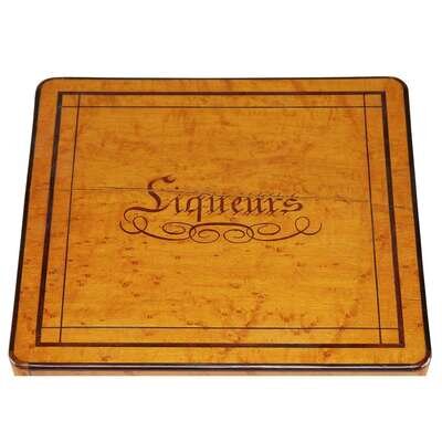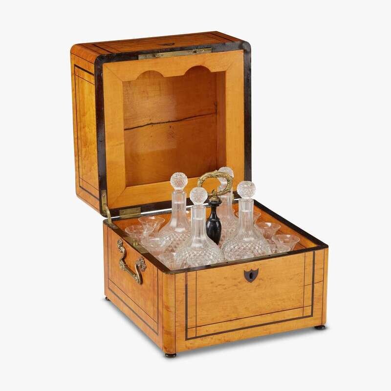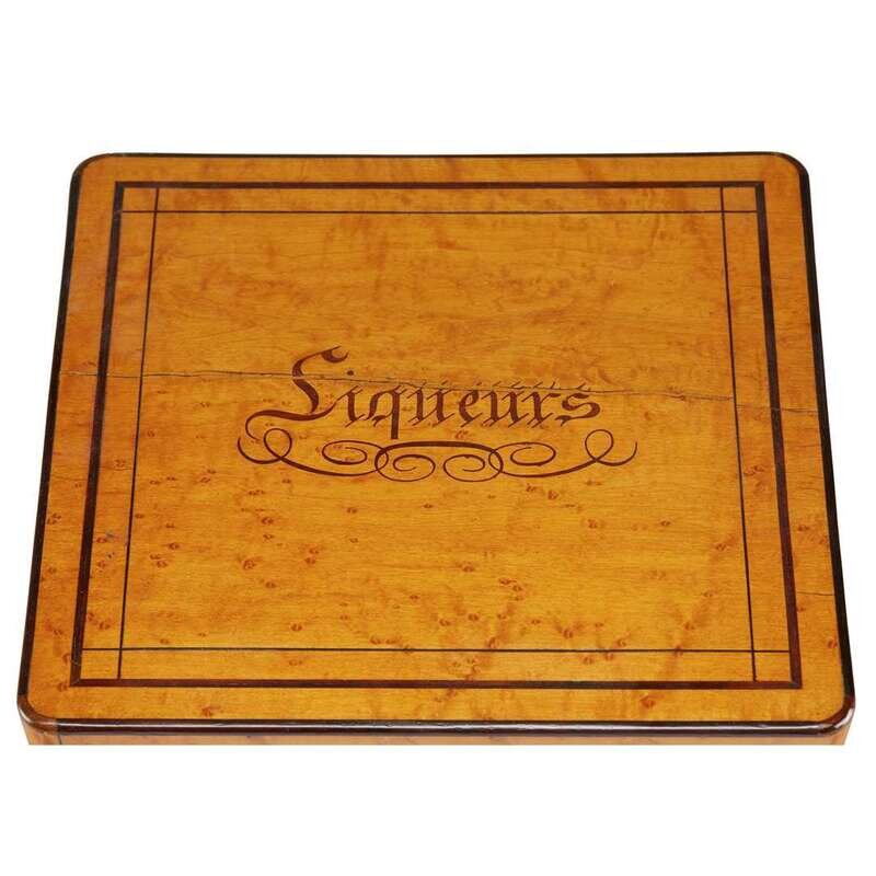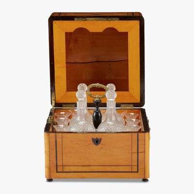 The inlaid chest opening to an interior with a removable fitting for four decanters and twelve cordial glasses.