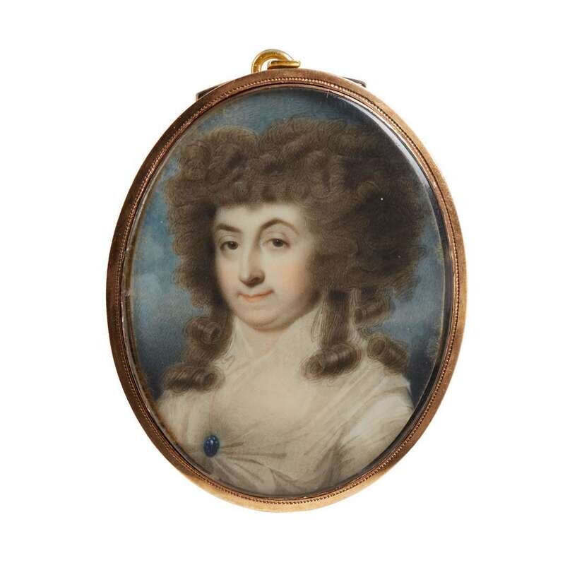 The first an oval portrait on ivory of a woman in white dress with a pin in her corsage, in gold frame; the second an oval portrait on ivory of a lady with powdered wig, the verso with plaited hair and blue glass, in original red leather case; together with an English School portrait of a lady, the verso with plaited hair centered by plaque inscribed "Souvenir". (3).