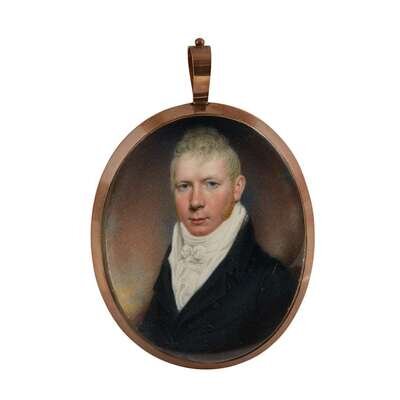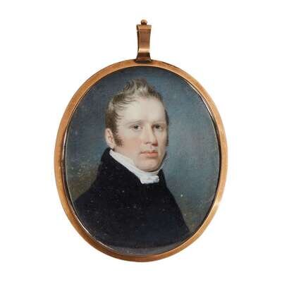 The first an oval portrait on ivory of a gentleman in black coat and white cravat, signed "P. Paillou 1809", in gilt metal frame; the second an oval portrait on ivory of a gentleman in black coat and white cravat, the verso with plaited hair centered by gilt monogram "WR", in gilt metal frame. (2).