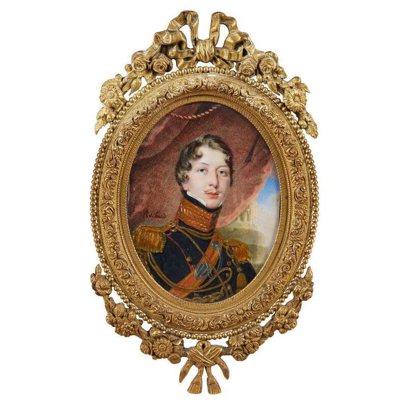 Oval portrait on ivory of Sir Augustus Frederick d'Este, KCH (1794–1848) in a gold and red collar and sash, gold epaulettes and blue coat before a curtain partially lifted to show a monument, signed "Rochard", the verso signed "Portrait de/Frederick Augustus/D'este/Fils d'un ?/le Duc de Sussex", in gilt bronze frame. Note: Sir Augustus Frederick d'Este, KCH (1794–1848) was the son of Prince Augustus Frederick, Duke of Sussex, and Lady Augusta Murray, and the grandson of George III. His parents' marriage was in contravention of the Royal Marriages Act 1772 and thus legally null and void. Therefore, Augustus d'Este was illegitimate for purposes of British law. He was born Augustus Frederick Hanover, but the last name was later legally changed to d'Este.
