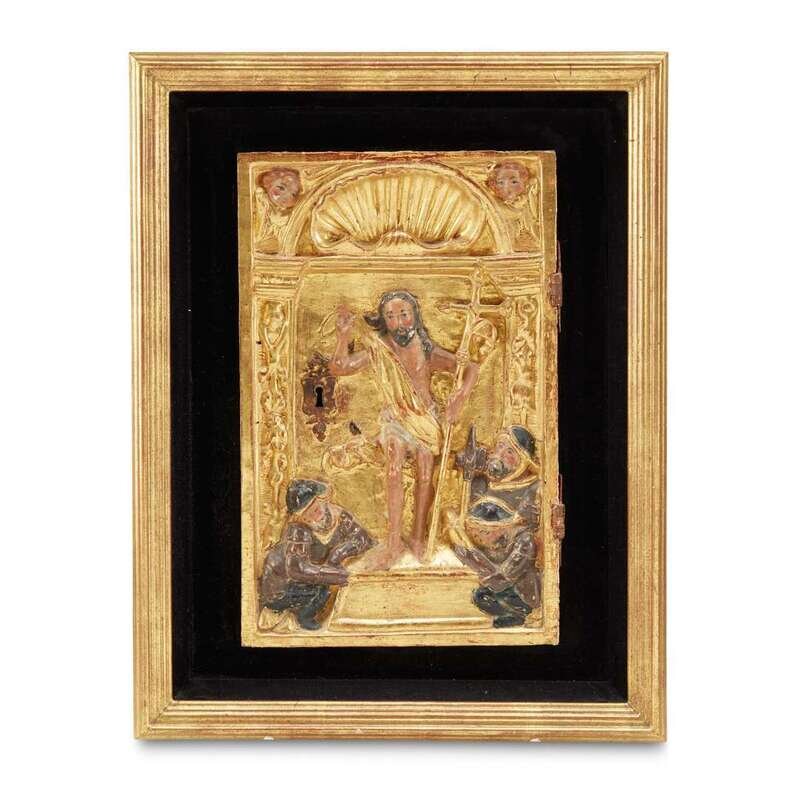 Carved in high relief, depicting the resurrection of Christ amongst the guards at the tomb from the Book of Matthew.