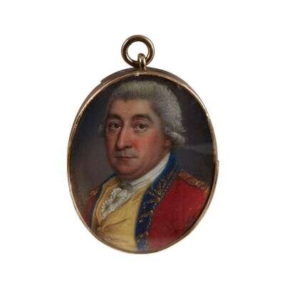 The first an oval portrait on ivory of a gentleman in blue coat, orange and white waist coat and powdered wig, signed and dated "Scouler 1797", the verso with blue glass encircling a woven hair decoration, in gilt metal frame, the second an oval portrait on ivory of an army officer in red coat with blue facings, in gold frame. (2).