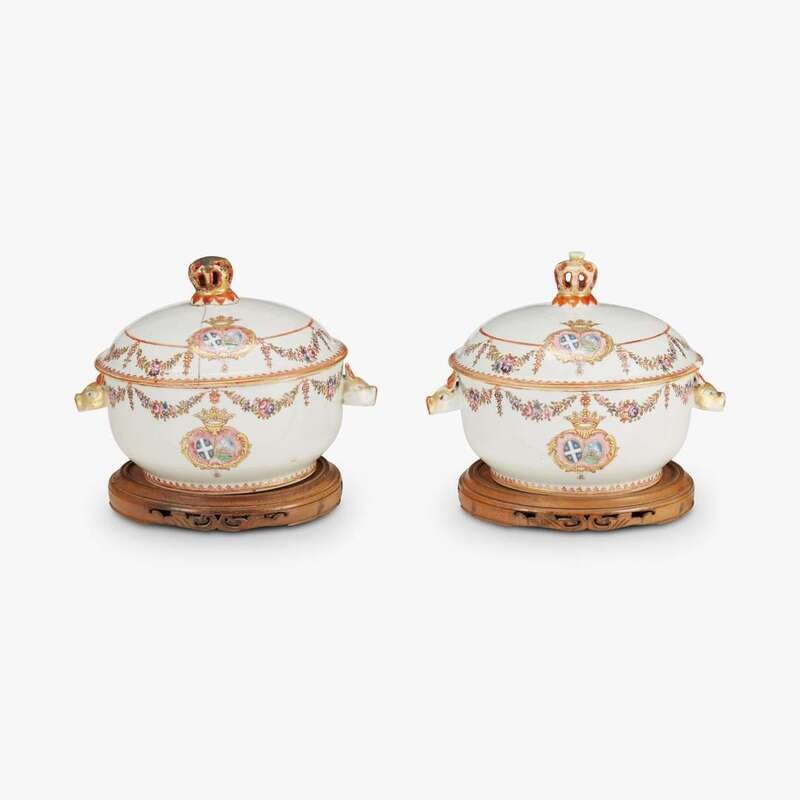 Each flanked with boar's head handles, painted with floral festoons in the famille rose palette and bearing arms of alliance for the wedding of Messire Guillaume-François Marie de La Noüe and Félicité-Marie Meslé de Grandclos in 1776. (2).