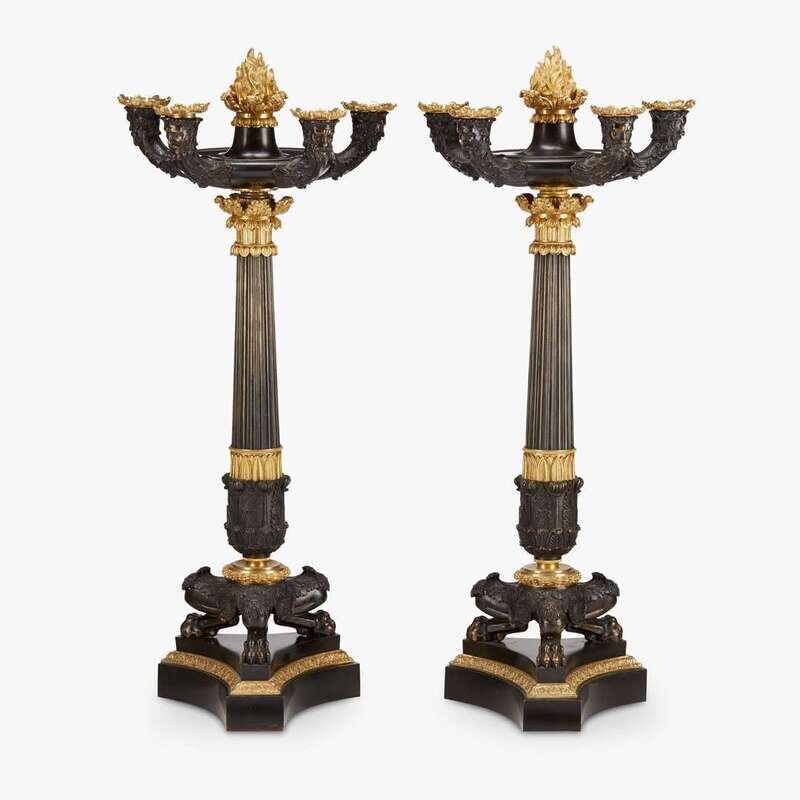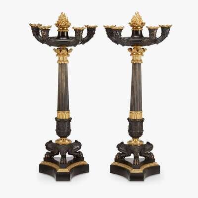Fine pair of Empire ormolu and patinated bronze five-light candelabra first quarter 19th century