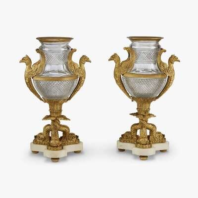 Fine pair of Empire style ormolu mounted cut glass urns 19th century