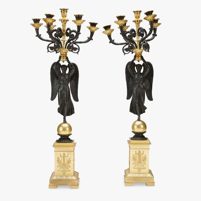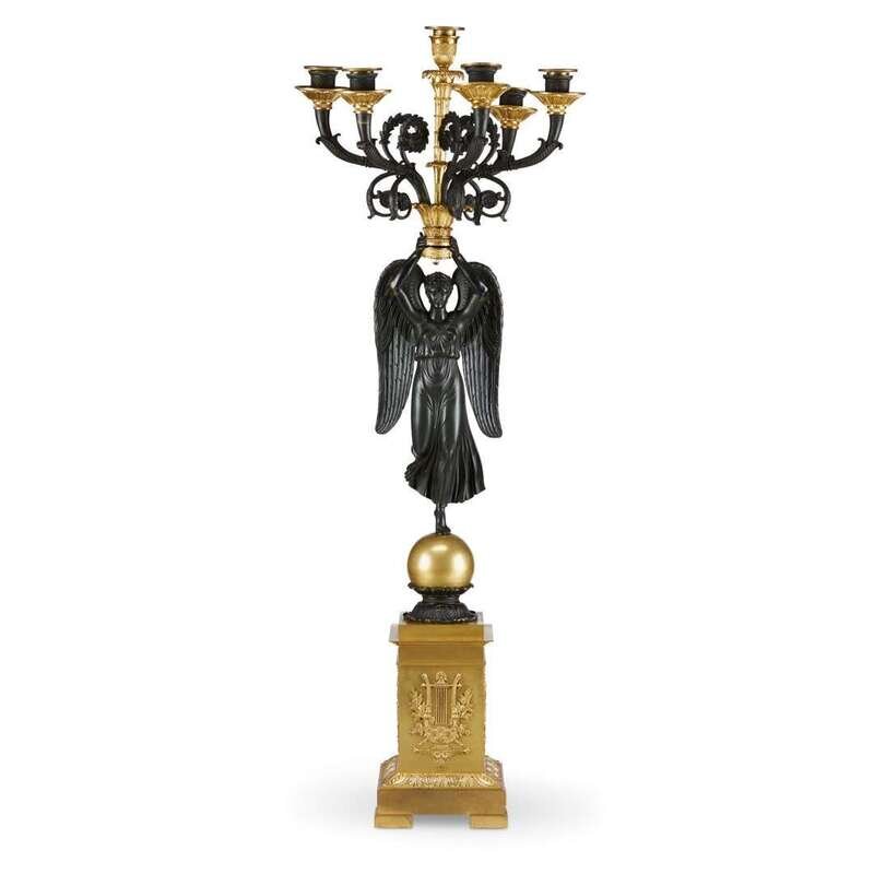 Each in the form of a winged victory standing atop an orb, holding aloft a basket issuing five scrolled candlearms and a central nozzle of papyrus, all raised on gilt bronze base applied with lyre and torches. (2).