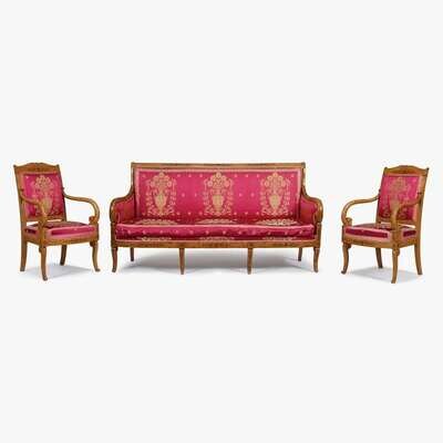 With rectangular padded back and bowed cushion seat, the crest and seatrail inlaid with foliate scrolls issuing from rosettes, raised on scrolled legs descending from lappets and upholstered in crimson silk with gold embroidery of Grecian style.