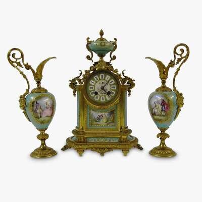 With Sèvres style mounts in a light green palette, together with a pair of ewers; the two-train movement stamped with Japy Frères "Medaille d'Honneur" medallion and HP & Co. pastille. (3).