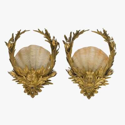 Each with dolphin-form backplate issuing two arms of bulrushes and reeds flanking a central frosted and molded glass shade in the form of a scallop shell; each numbered and one faintly marked to the interior with "C" within a lozenge. (2).
