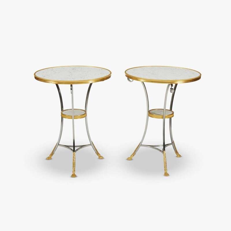 Pair of Louis XVI style gilt bronze and steel marble top guéridons 20th century